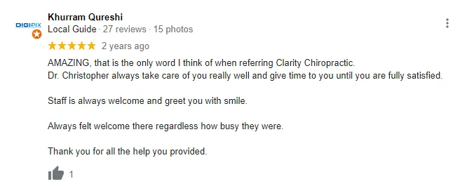 Disclaimer: Procedures and treatments performed by XXX - Clarity Chiropractic have an inherent success (and failure) rate. Reviews, testimonials and content on this site should not be interpreted as a statement of efficacy of procedures and treatments performed by XXX - Clarity Chiropractic for anyone else.